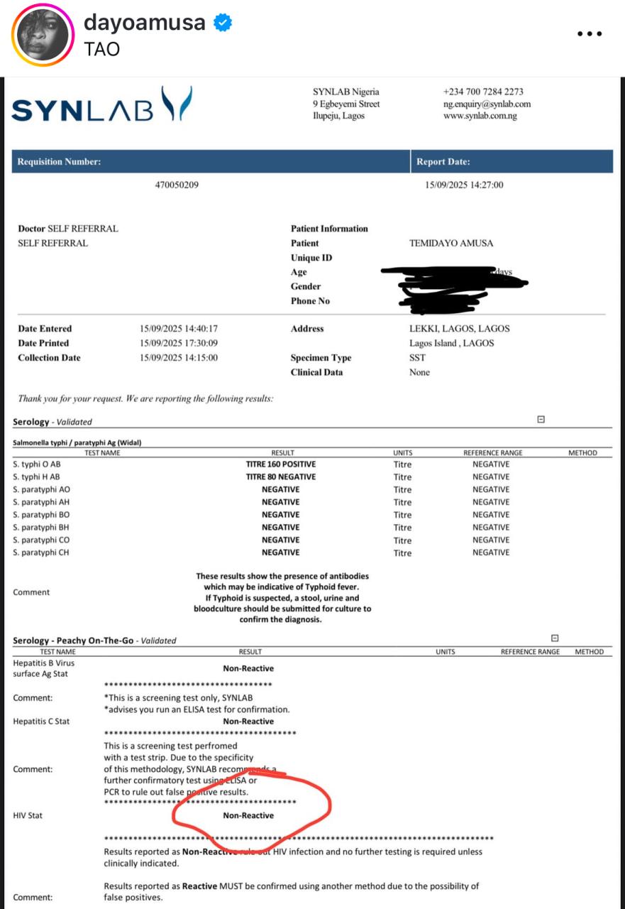 In response to the renewed allegations, Amusa on Tuesday posted a photo of her latest HIV test result on Instagram, which confirmed her negative status.