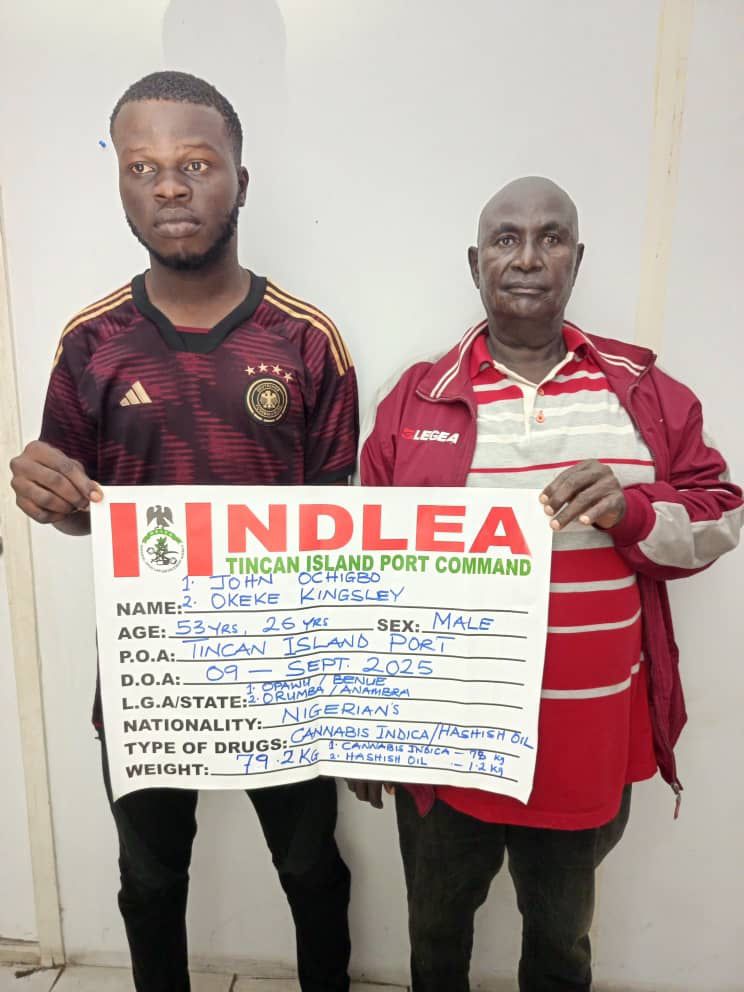 “At the Tincan port in Lagos, a total of 161 parcels of Canadian Loud, a strain of cannabis weighing 81.7kg and 1.2kg hashish oil were recovered from a 40ft container of vehicle spare parts and used vehicles imported from Montreal Canada during a joint examination of the shipment on Tuesday September 9. Two suspects: John Ochigbo, 53, and Okeke Kingsley, 26, have been taken into custody in connection with the seizure.