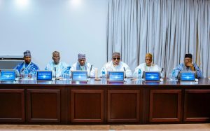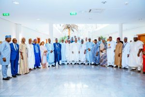 (L-R) Deputy Chief of Staff to the President, Sen Ibrahim Hassan Hadejia; DIG Habila Joshak (Rtd); Hon. Beni Lar; Alhaji Mahmud Yayale Ahmed; Amb Baba Ahmed Jidda; Hajia Aishatu Ismail; Amb Ibrahim Mai-Sule; His Excellency Muktar Lamara Yero; Arc. Ibrahim Bunu; Chairman of the Board of Trustees of the Arewa Consultative Forum, Alh Bashir Dalhatu; Vice-President Kashim Shettima; Chairman, National Executive Committee of the Arewa Consultative Forum, Mamman Mike Osuman; Sen Ibrahim Ida; Alhaji Murtala Aliyu; Mrs Maimuna Yaya Abubakar; Lt. Gen. Abdurahman Bello Danbazau (Rtd); Alhaji Ibrahim Sidi Bamalli; IGP M.D. Abubakar (Rtd); Alh Nasiru H. Danu and others during a courtesy visit to Vice-President Kashim Shettima by the leadership of Arewa Counsultative Forum (ACF) at the Presidential Villa in Abuja on Wednesday (29-10-2025)