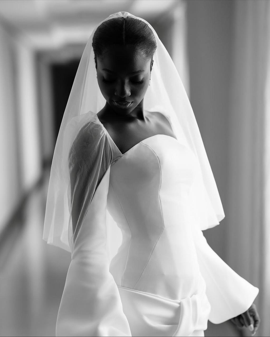 Nichole Stylish designed this pristine masterpiece, perfectly balancing modern design with timeless elegance. This absolutely breathtaking wedding dress features a lovely veil, statement sleeves with a sheer shoulder start, a fitted silhouette with a waist drape, and a beautiful train. Combined, these elements create an effortlessly ehereal look. Tea Styles created a sleek hairdo just as elegant as the dress, and the subtle yet glowy makeup by Mosewa Beauty revealed the full pristine beauty of this ensemble. This is bridal elegance at its finest — refined and absolutely breathtaking. If you are a bride searching for something minimalist yet impactful and graceful, then this look right here has your name written all over it.