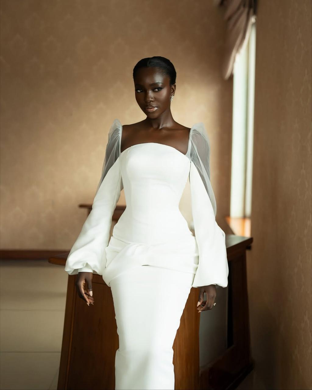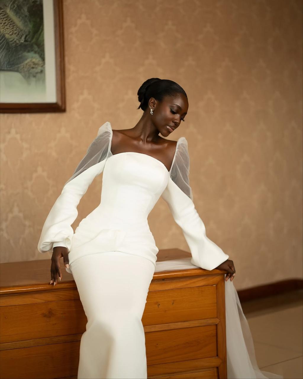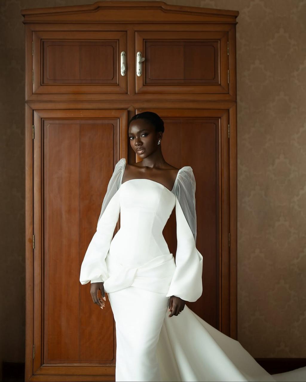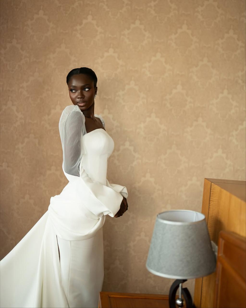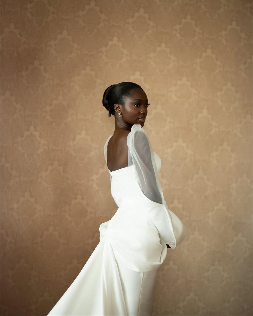 Nichole Stylish designed this pristine masterpiece, perfectly balancing modern design with timeless elegance. This absolutely breathtaking wedding dress features a lovely veil, statement sleeves with a sheer shoulder start, a fitted silhouette with a waist drape, and a beautiful train. Combined, these elements create an effortlessly ehereal look. Tea Styles created a sleek hairdo just as elegant as the dress, and the subtle yet glowy makeup by Mosewa Beauty revealed the full pristine beauty of this ensemble. This is bridal elegance at its finest — refined and absolutely breathtaking. If you are a bride searching for something minimalist yet impactful and graceful, then this look right here has your name written all over it.