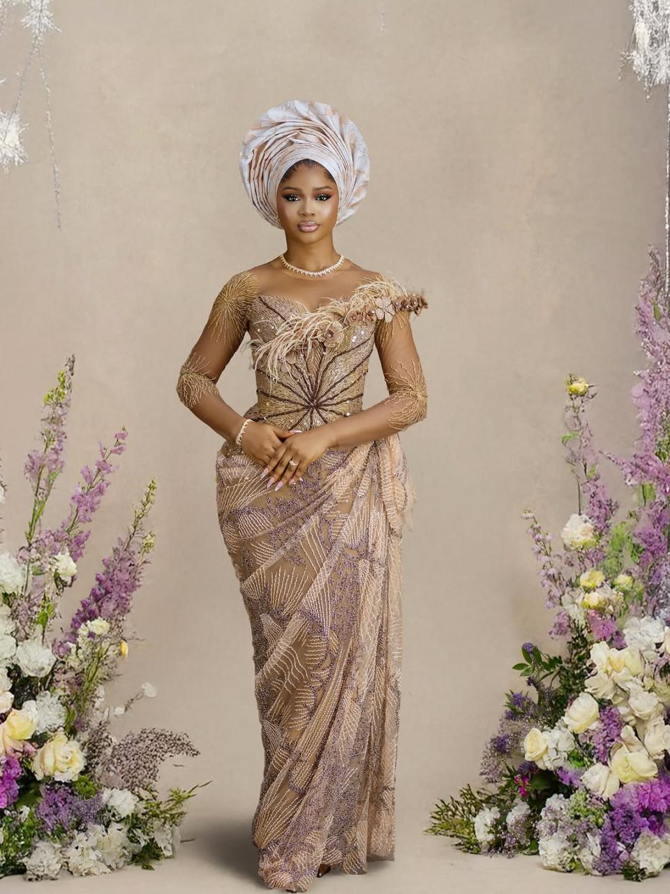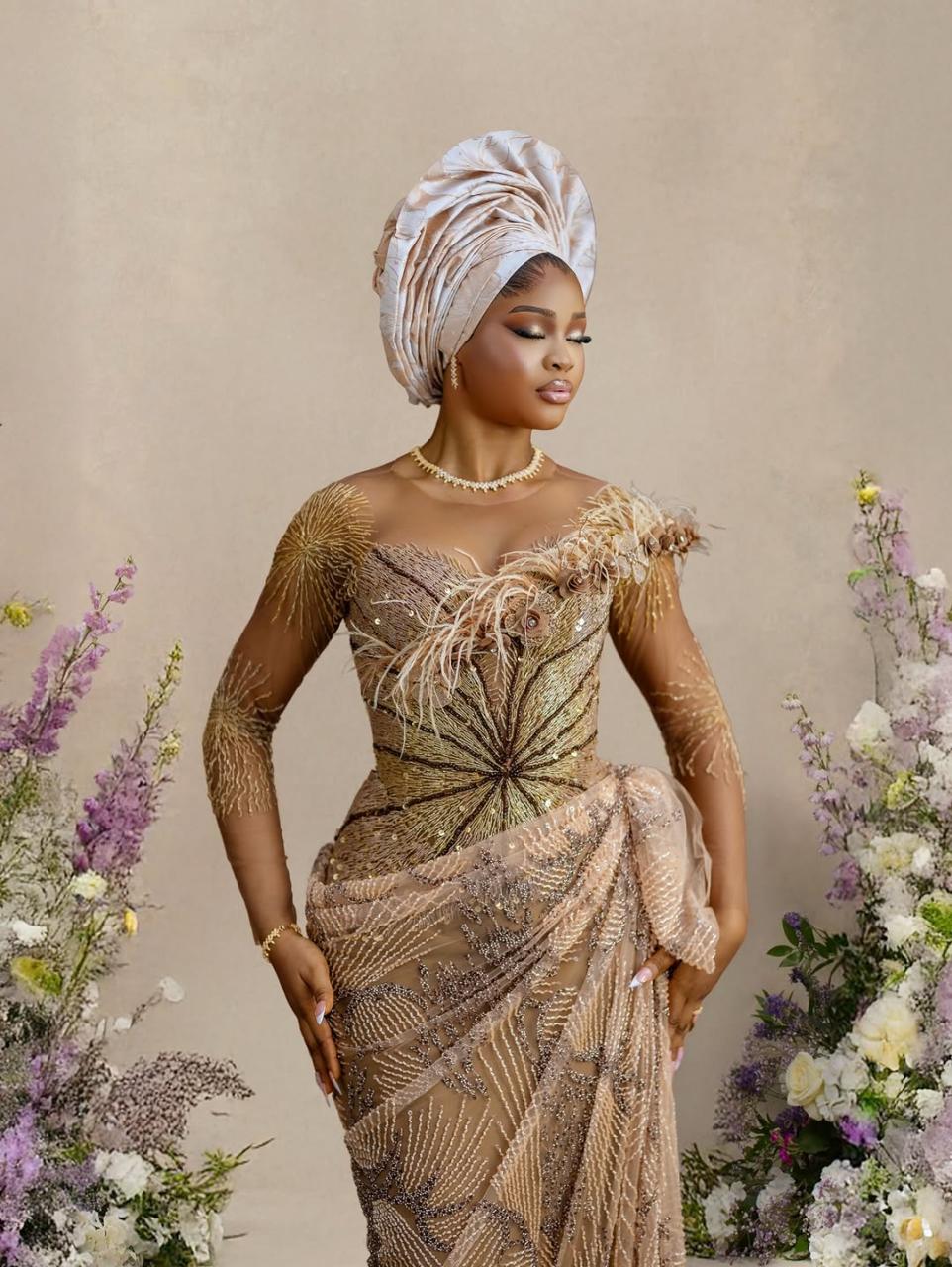 House of Fify NG brought that vision to life with this stunning mesh masterpiece. With a neckline featuring feathers and floral designs, star-like beading across the sleeves and bodice, and an equally beaded, draped skirt, this look screams pure luxury. True to its cultural roots, the look was served with a perfectly pleated gele by Ife Boy Gele. The makeup by Liyat Beauty Empire is simply gorgeous, featuring a nude, glowy finish that perfectly ties the look together. One glance is enough to see how breathtaking this ensemble is — a bridal look truly fit for a queen.