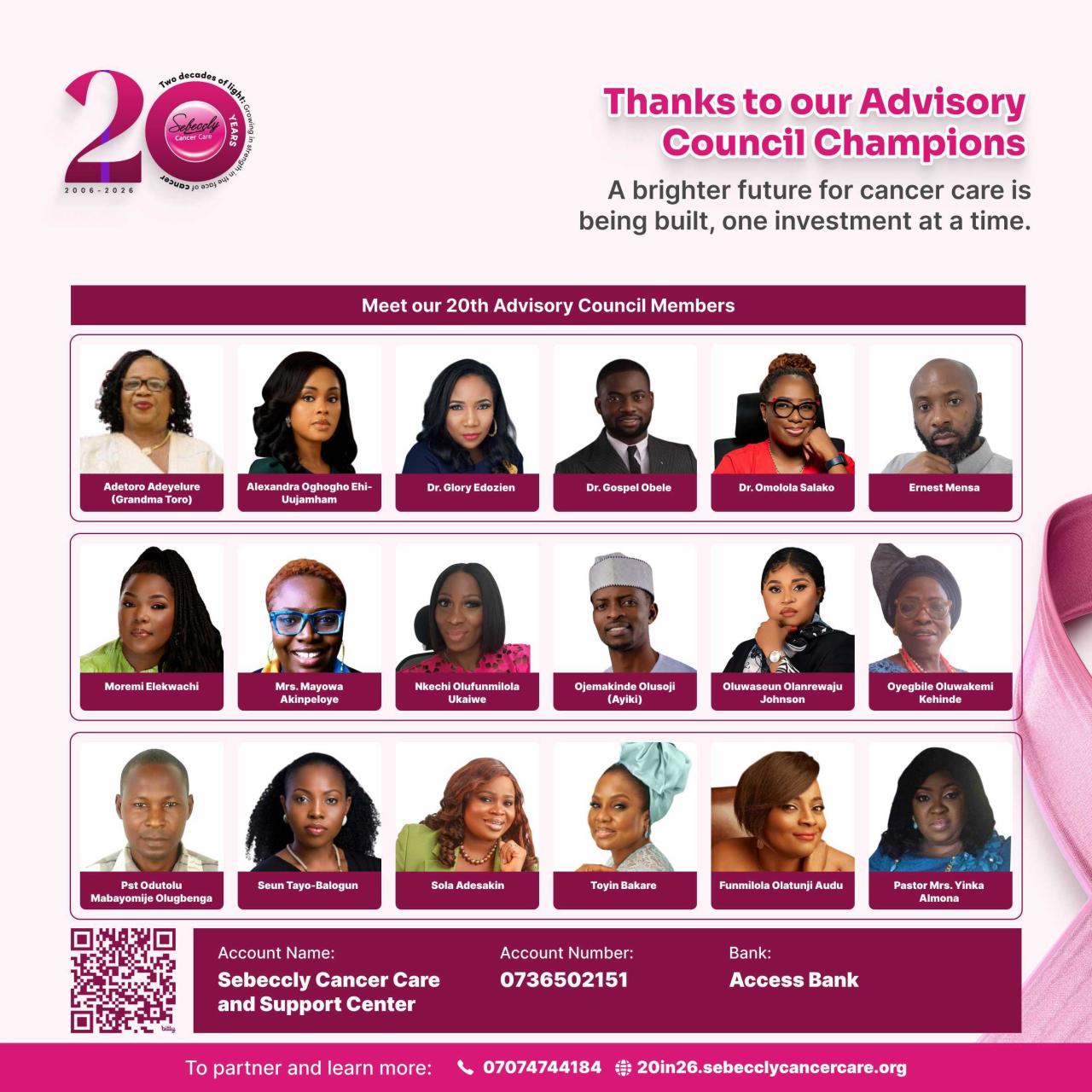 “Our Advisory Council members embody the spirit of leadership, compassion, and innovation that has fuelled Sebeccly’s impact for nearly two decades,” said Dr Omolola Salako, Founder of Sebeccly Cancer Care and renowned Clinical Oncologist. “Their collective experience will be instrumental in shaping the legacy and sustainability of our 20in26 campaign.”