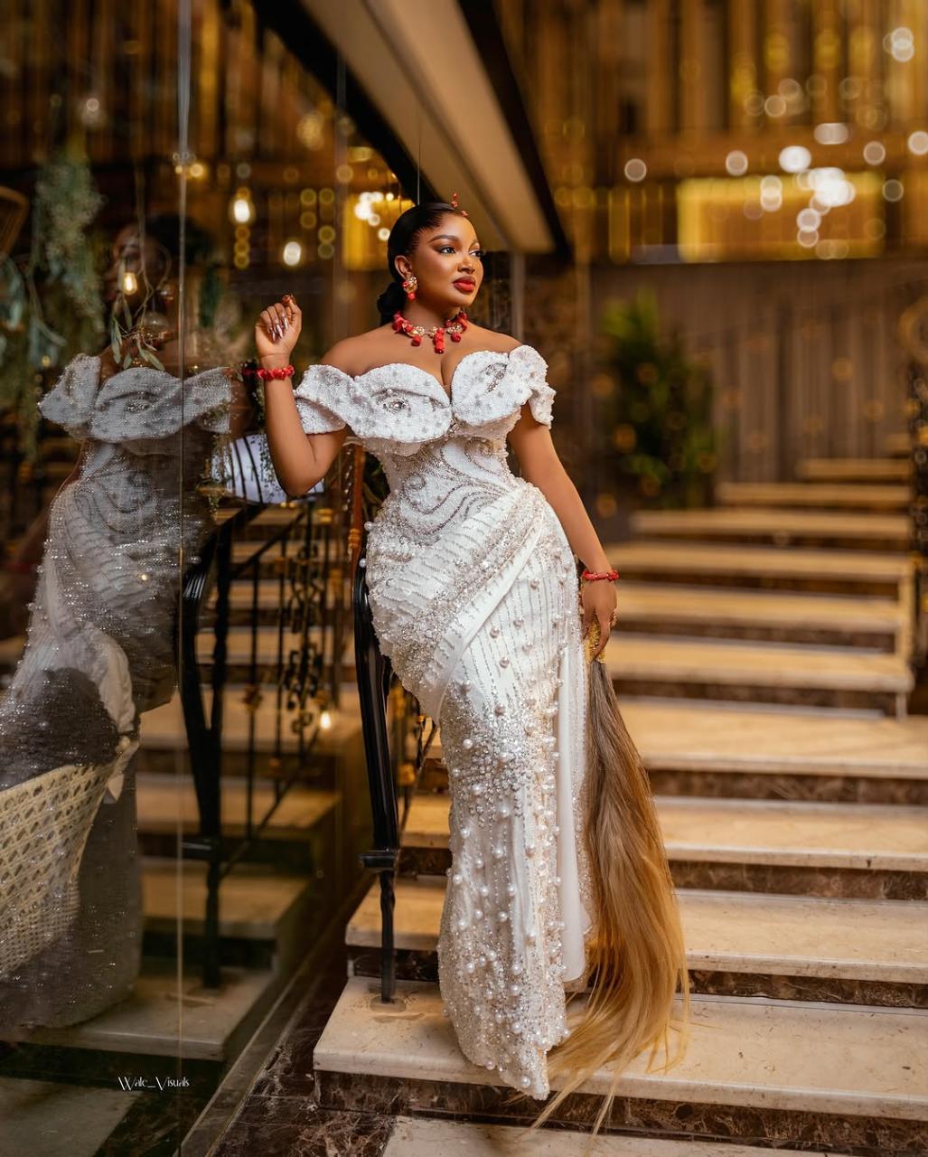 Papaya Ex is serving us premium Igbo bridal beauty in this stunning dress by A1 Clothings. From the sculpted off-shoulder neckline, draped waistline, to the intricate beadings all over the silhouette, this look speaks pure glamour. Paul Glam delivered this pretty bold makeup, featuring red lips and a glowy finish, while Hair by MJ Forge styled the hair into a sleek low bun, decorated with Igbo ceremonial coral beads. It’s regal, elegant and just what you need to exude much grace and fabulous style on your wedding day.