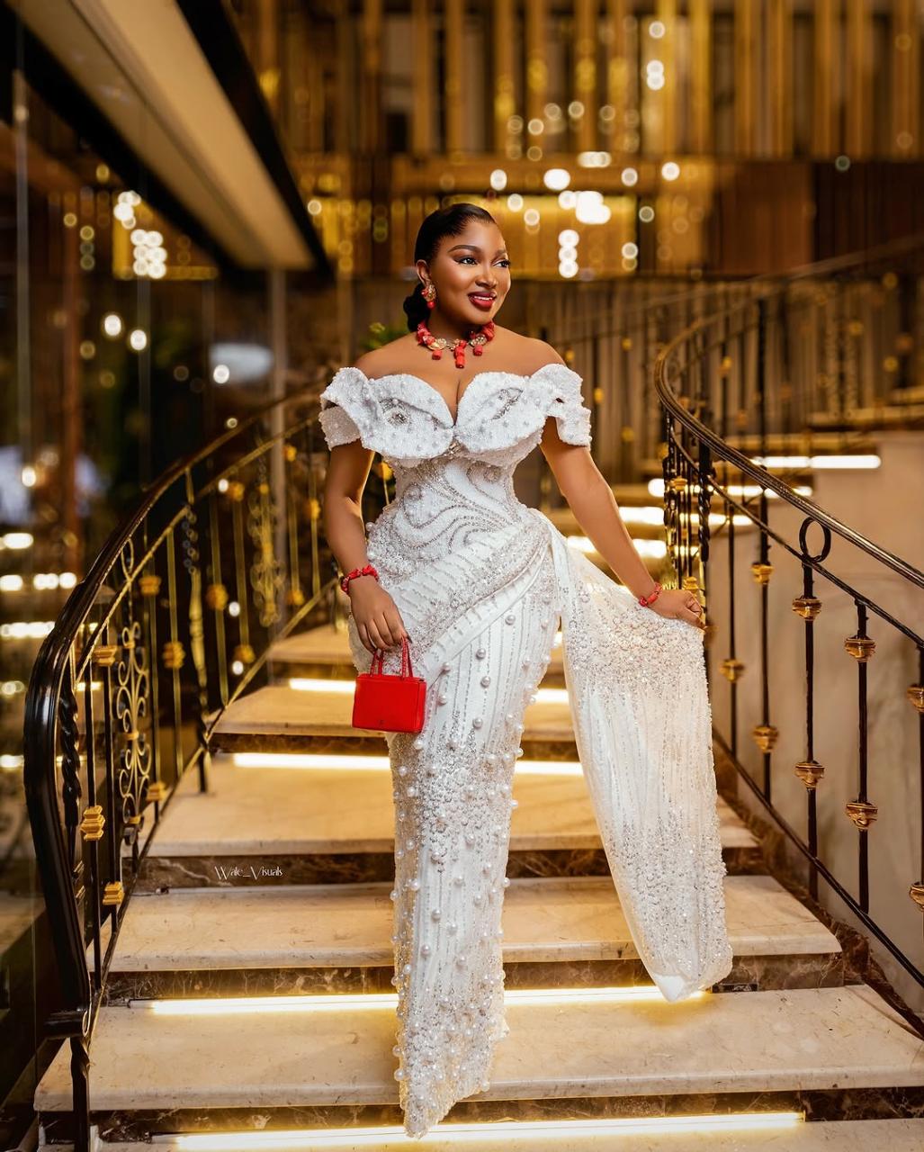 Papaya Ex is serving us premium Igbo bridal beauty in this stunning dress by A1 Clothings. From the sculpted off-shoulder neckline, draped waistline, to the intricate beadings all over the silhouette, this look speaks pure glamour. Paul Glam delivered this pretty bold makeup, featuring red lips and a glowy finish, while Hair by MJ Forge styled the hair into a sleek low bun, decorated with Igbo ceremonial coral beads. It’s regal, elegant and just what you need to exude much grace and fabulous style on your wedding day.