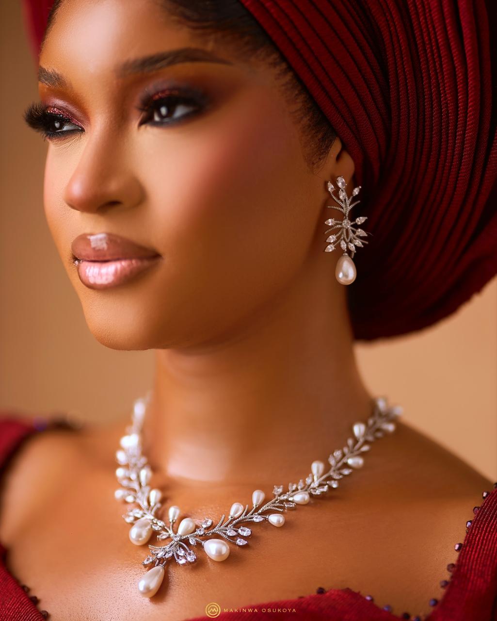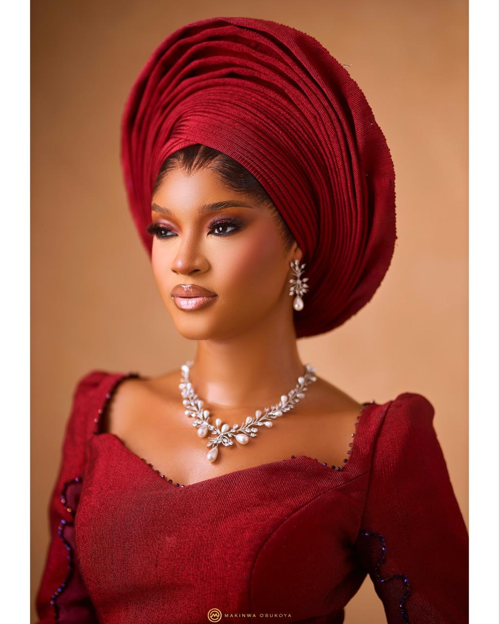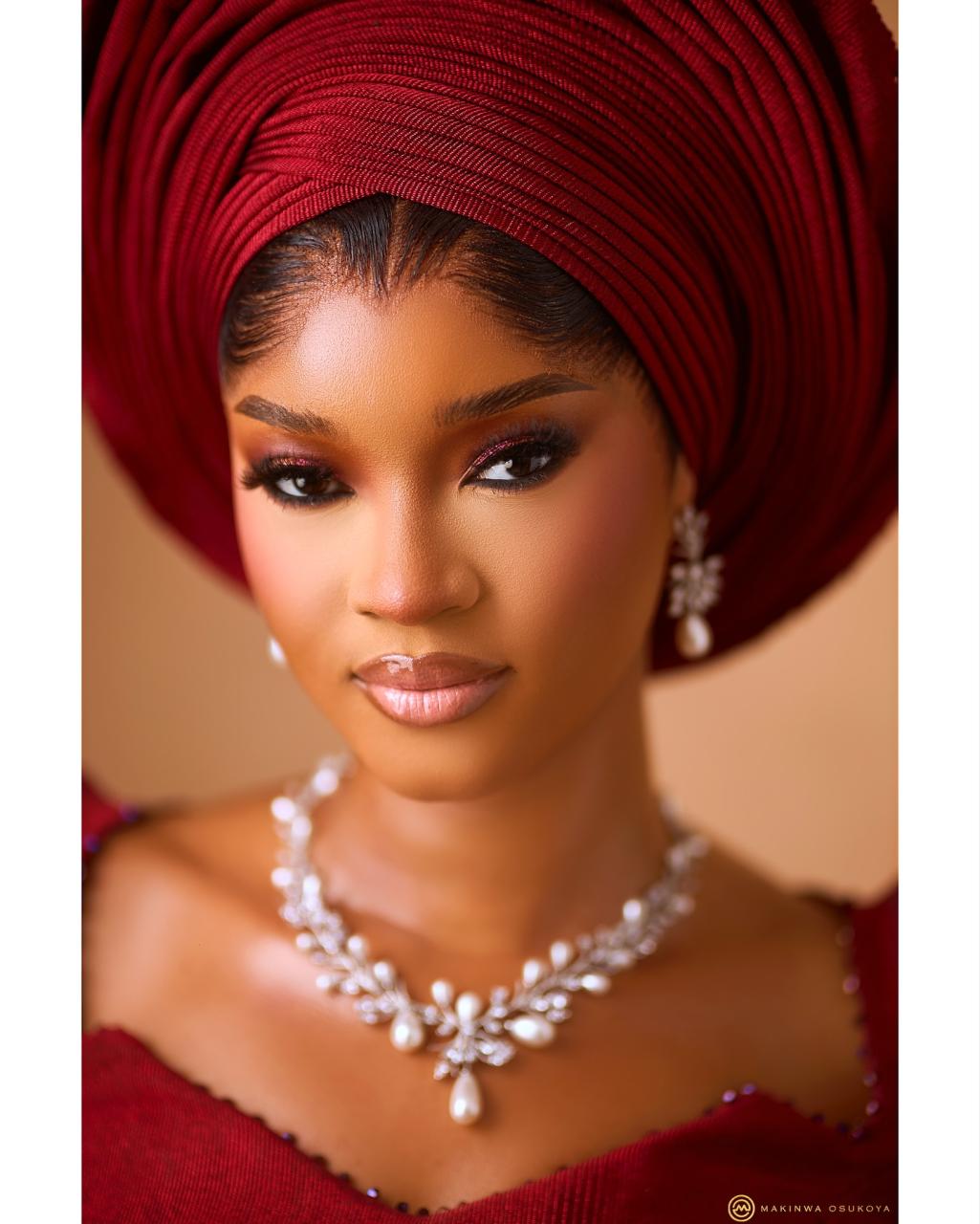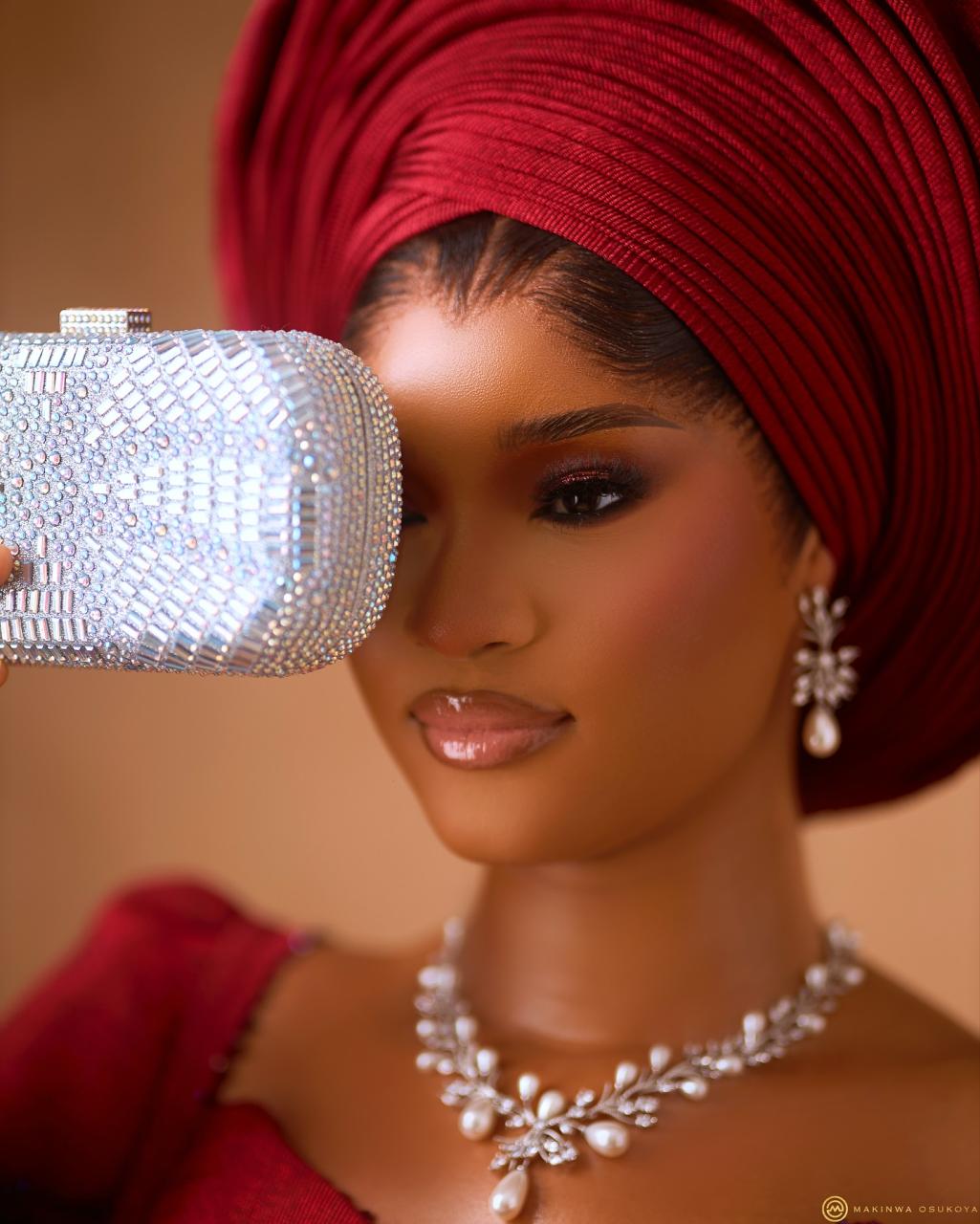 Perfectly designed by The House of Temmy, this red asooke look is a complete stunner from head to toe. The beautifully structured dress features a sweetheart neckline, slightly puffy shoulder sleeves and beaded checker detailing on the skirt — all in all, a true vision of cultural elegance. A Yoruba bride and her gele are like two peas in a pod, and Temmy’s Gele understood the assignment with this well-pleated gele, very sharp and classy. Adding a striking touch to the look is this bold, glowy makeup by Glam by Temi, ultimately tying the regal ensemble together. Your stylish bridal dreams are within your reach with this beautiful look at the top of your list, so go for it!