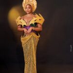 What drew our eyes instantly was the embroidery spread across the chest of the agbada — a stunning arrangement of geometric shapes in gold and bronze, woven together with touches of red and burgundy. The closer you look, the more artistic it becomes, almost like a crafted piece meant to be studied. Against the black fabric, the detailing really comes alive.