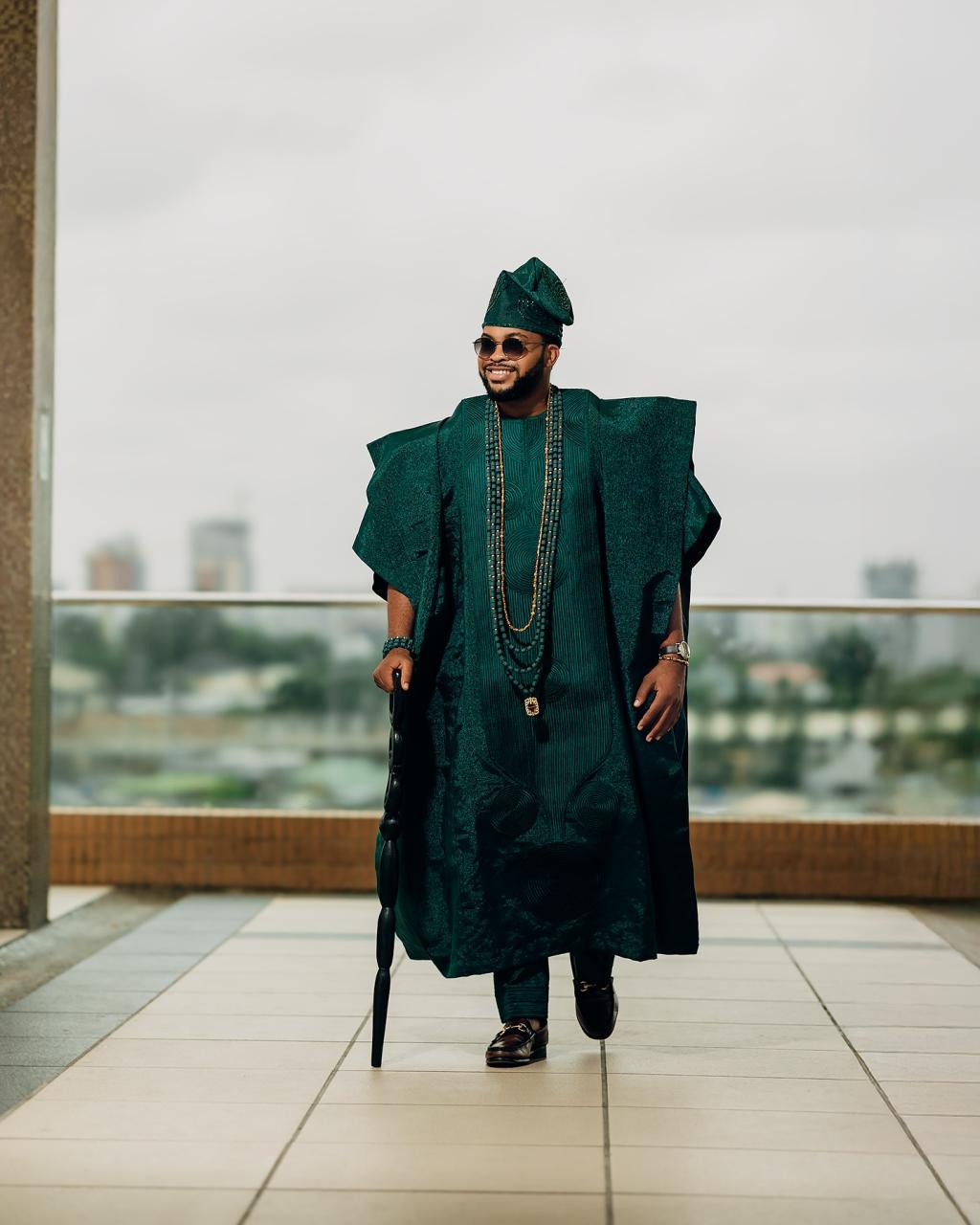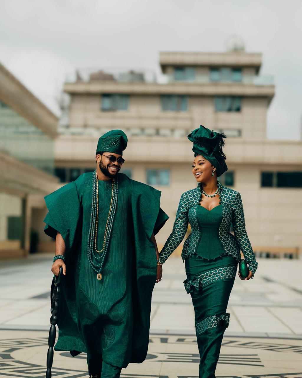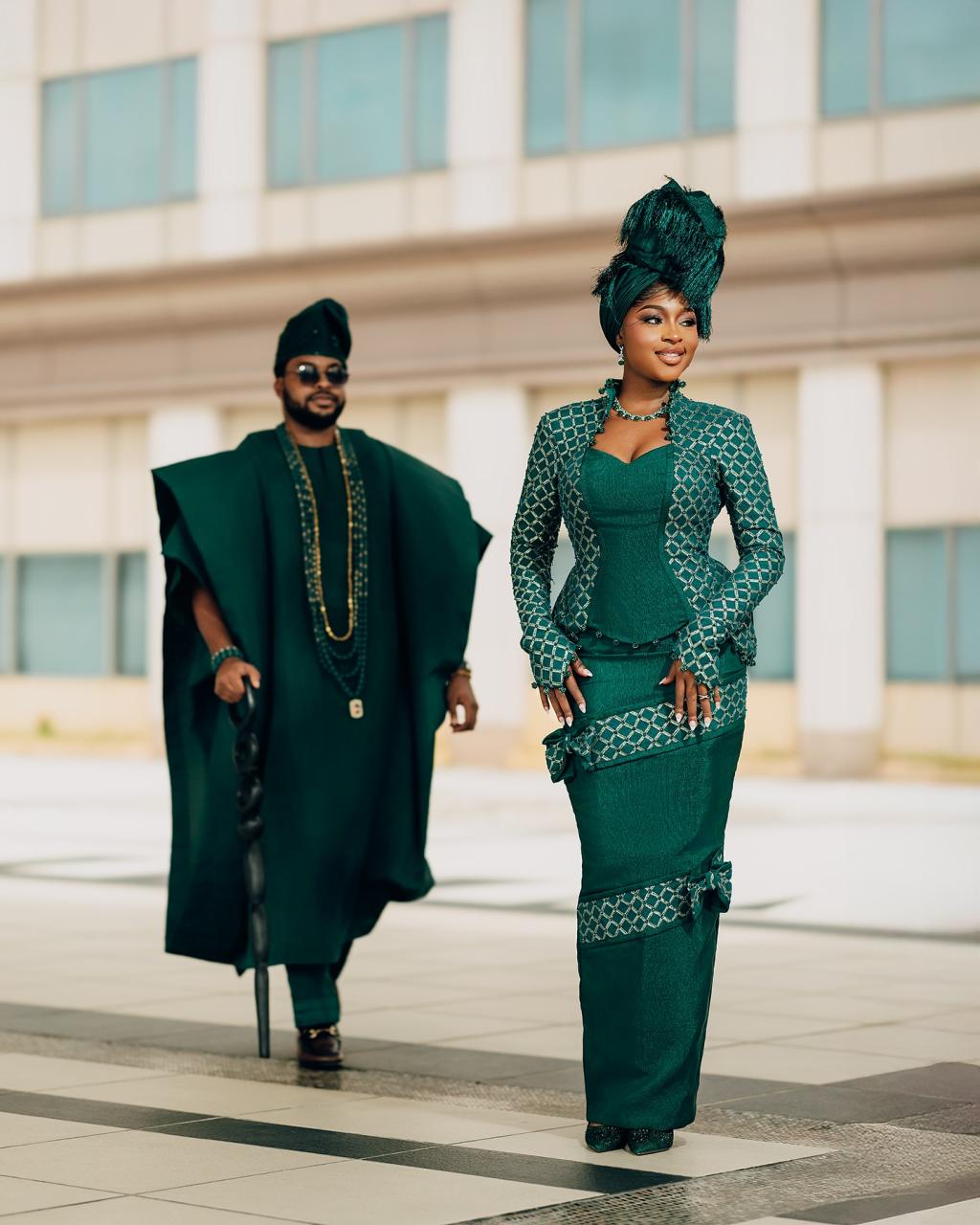 Infused with a modern flair, this green Yoruba traditional wedding look is wrapped in timeless elegance and grace. With the agbada embroidered to perfection and the bridal look’s amazing features, this combination intertwines beautifully into a look that tells a story of rich culture, high glamour and sweet love. You deserve to look like royalty on your Yoruba trad, so this is your sign to let culture and couture crown that special day in grand style.