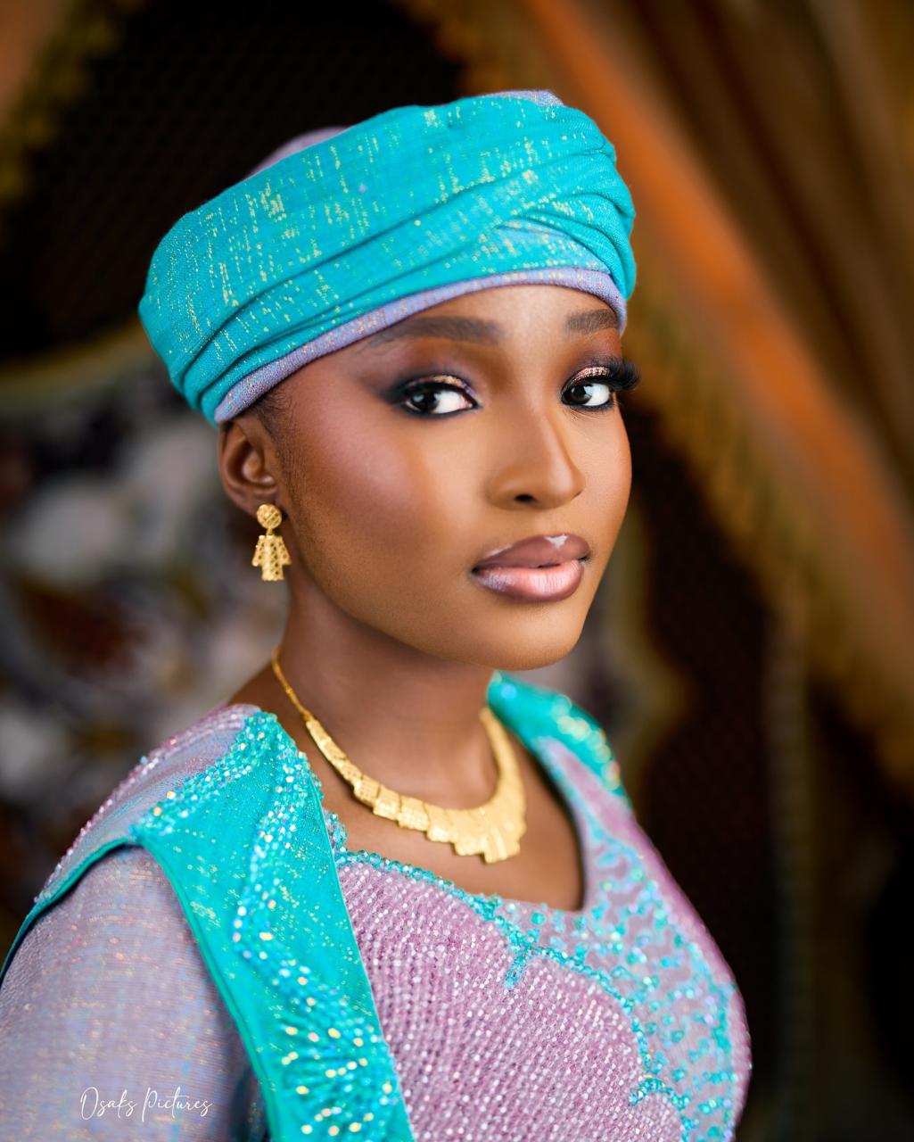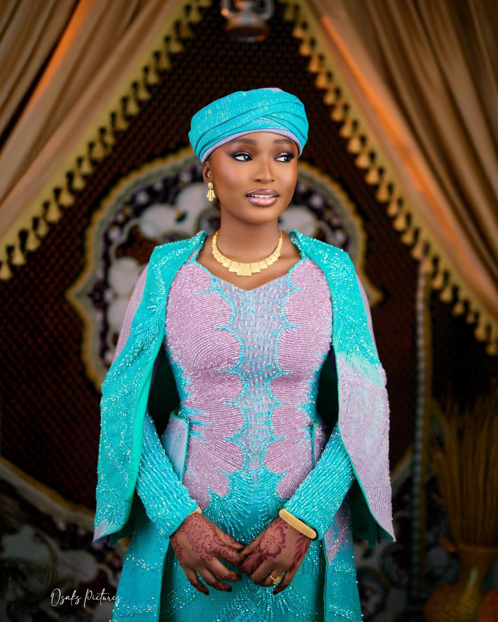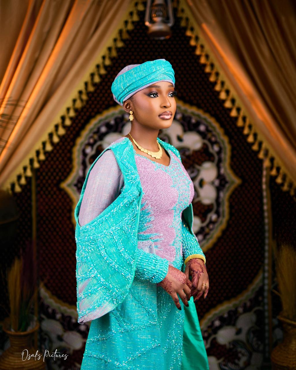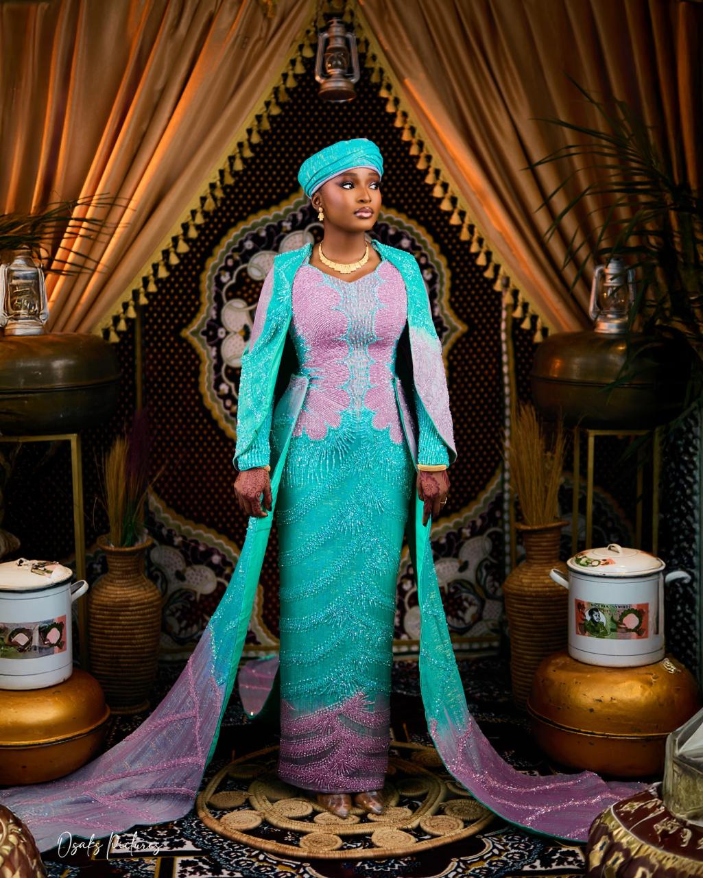 Loveth King Styling brought this blue-pink, vibrant look to life in a truly stunning way. From the detachable cape design, the intricate beadings across the silhouette and the triple train attachments, this look screams pure luxury. True to the Northern roots, Ire’s Touch delivered this well-pleated turban, adding a regal touch. Roma Touch of Beauty then tied the ensemble altogether with this glamorous makeup look. The result? An amazing combination that showcases expert craftsmanship. All being said, this is your cue to let the elegance and glitter of this beautiful look crown your Northern traditional wedding in grand style.