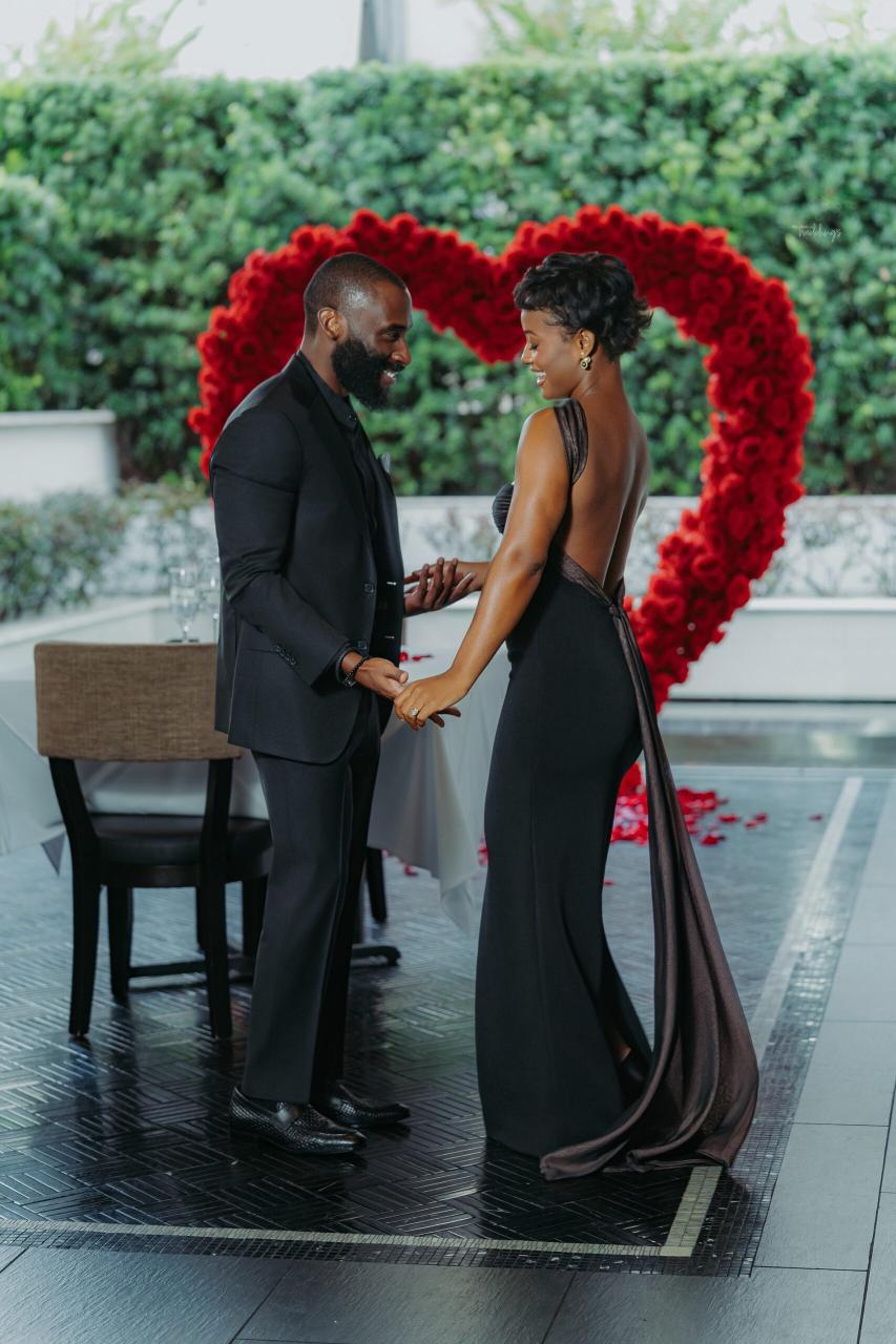 This magical love story has been brewing for many years, ever since Chisom was a teenager. She had stumbled upon the name “Ketandu” and fallen in love with it. What she didn’t know was that many years later, someone who bore a very similar name would find her on Instagram, and they would fall head over heels in love. Once she saw Kesandu’s friend request, she knew immediately that fate was working its magic. Without any hesitation, she opened herself to the beautiful possibilities, and oh, she was not disappointed at all! The outcome? A deep connection that has led them to their absolutely romantic proposal in Houston! Kesandu planned this beautiful surprise for her in her favourite restaurant. Against the stunning floral setup, Kesandu got down on one knee to ask that special question, and Chisom said yes! Now forever is so nearby, and we are delighted to share in their joy. Their proposal photos tell a tale of electric chemistry, sweet love and romance. Each frame of their elegant black tie look warms our hearts deeply, confirming that truly theirs is a love written in the stars. 😍
