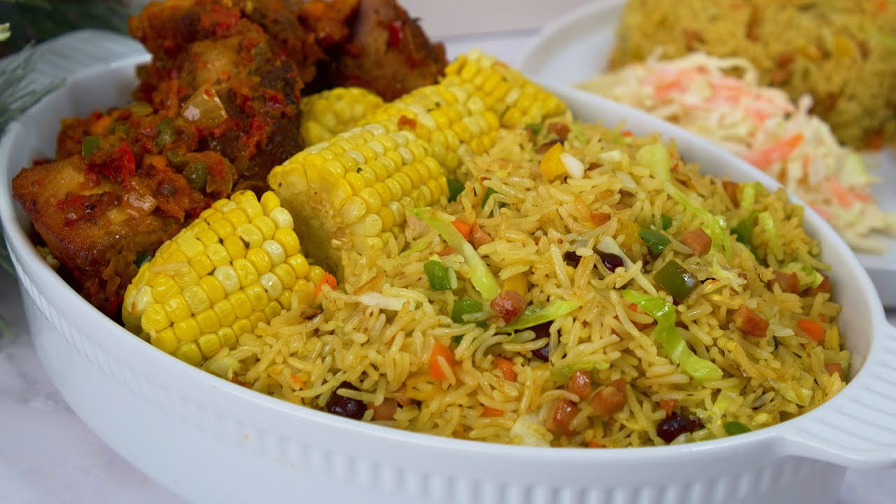 The turkey is seasoned simply but generously, with a mix of curry, thyme, sage, rosemary, parsley flakes, salt and seasoning powder. Fried with onions, garlic, ginger and red bell peppers, it’s cooked until just right, giving the rice something substantial without overpowering the vegetables. The rice itself is cooked in meat stock, with oil, grated garlic and ginger, and blended green bell pepper, which gives it colour and a subtle depth of flavour before it even hits the pan.
