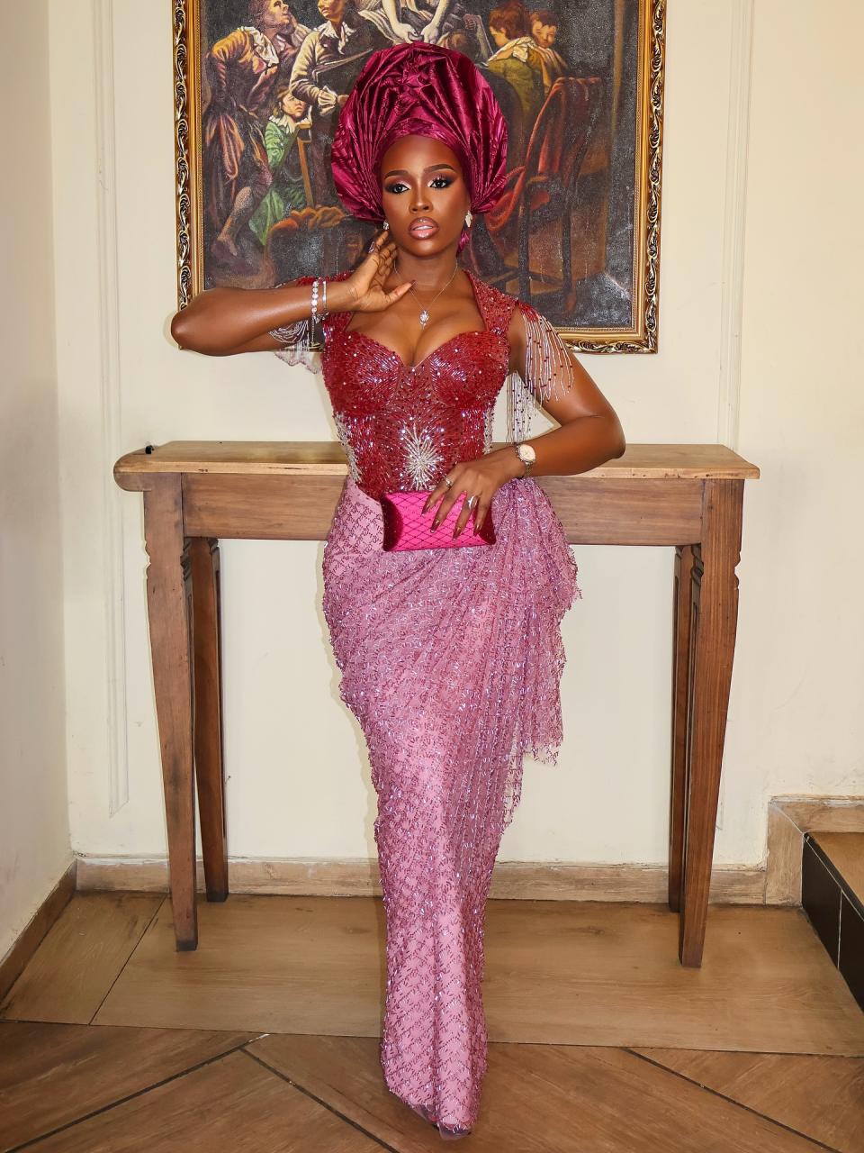 Belle: @tomike_a | Stylist: @veekee_james | Dress: @stylebysai | Makeup: @tmtbylayinka | Photography: @olamide_david | Gele: @oni_gele | Hair & frontal installation @malliaworld | Accessories: @pinkperfection_accessories | Purse: @shopluxextra