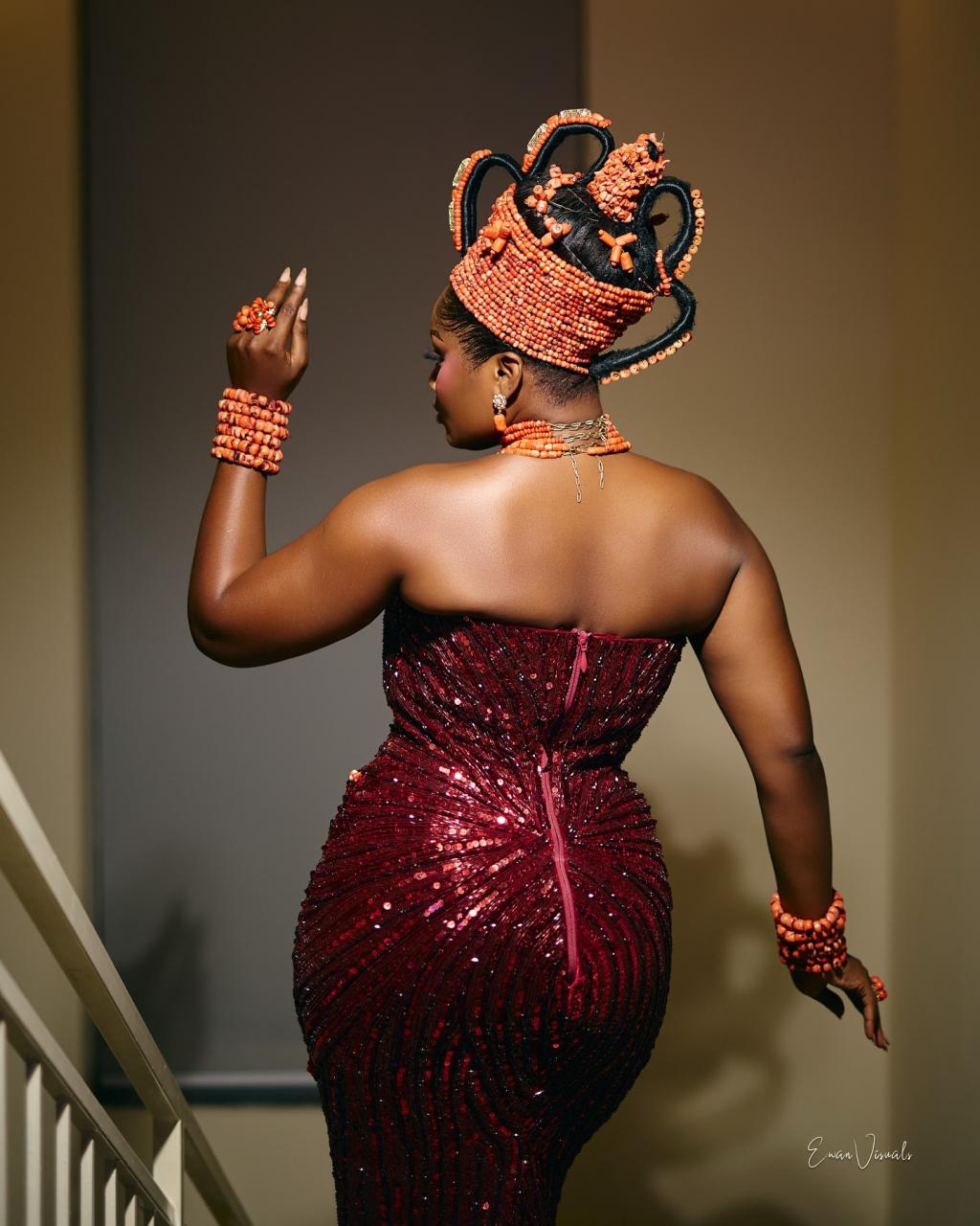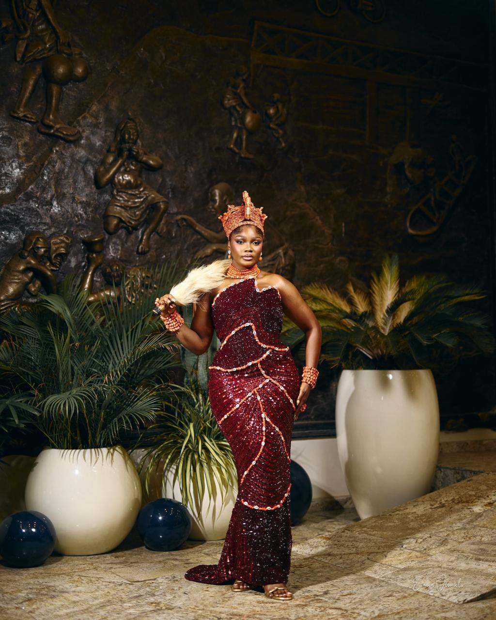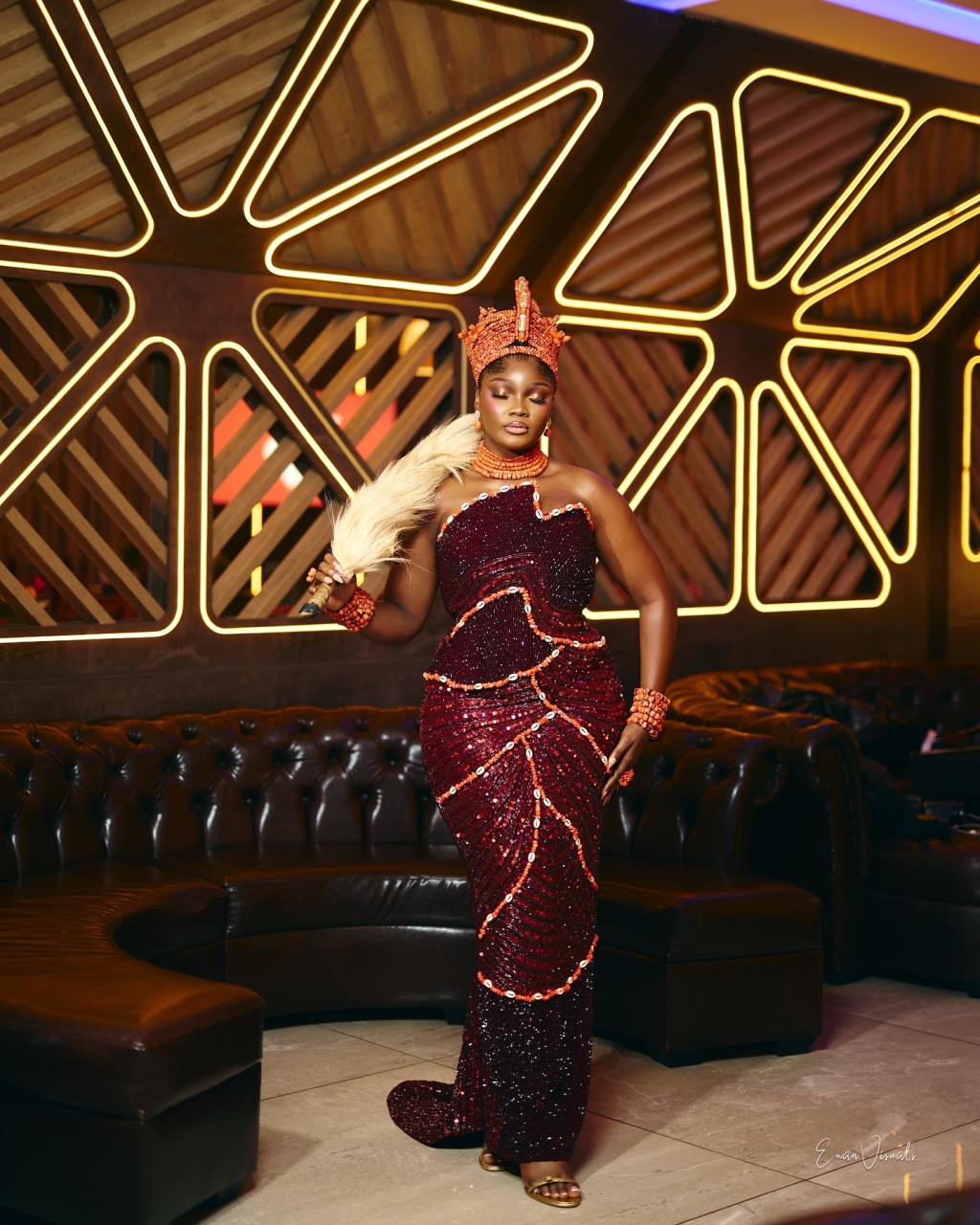 Tinnuques has designed a dress so stunning that it would have you looking like proper royalty as you step into your wedding. From the cut-out sleeveless neckline to the fully beaded silhouette bordered by cowries and coral beads, this look is a pure vision of bridal excellence. For that beautiful traditional touch, Okuku by Fola brought the majestic Okuku to life, and Highlights by Sophie took the ensemble up a notch with this flawless makeup finish. This look is a stunning conjunction of rich culture, expert craftsmanship and excellent detailing— everything you need to make your big day a truly enchanting spectacle.